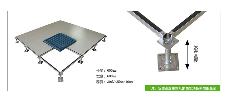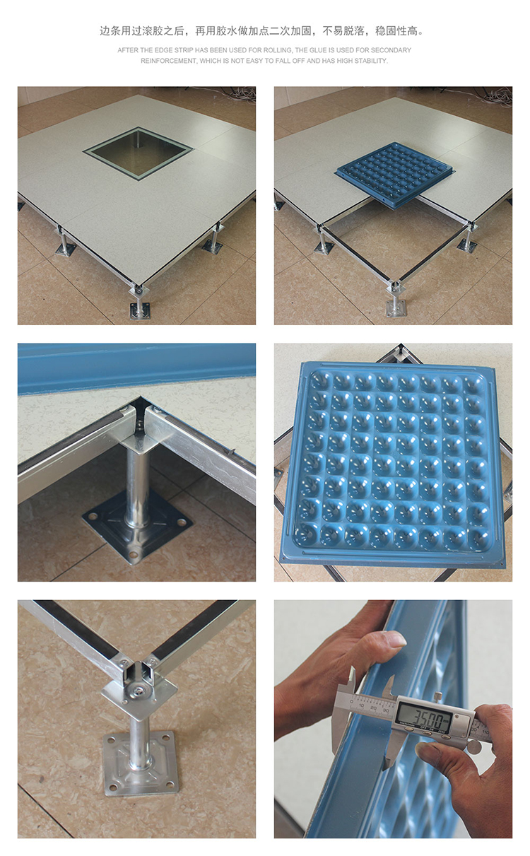 全鋼防靜電地板為全鋼組件,分有邊、無邊、微邊(三種邊處理方式)。底面采用SPCC深沖冷軋板拉伸成型鋼板厚度(0.4~1.5mm),球窩狀結(jié)構(gòu),增加地板的機(jī)械荷載強(qiáng)度。面板采用硬質(zhì)SPCC鋼板(0.5~2.0mm),上下經(jīng)過點(diǎn)焊焊接成型,切邊沖孔后,經(jīng)防銹處理,環(huán)氧樹脂粉末靜電噴涂后,中間填充發(fā)泡水泥(可以根據(jù)客戶需求發(fā)泡不同重量),再經(jīng)過日曬養(yǎng)護(hù)后形成穩(wěn)定的承載結(jié)構(gòu)。地板上表層粘貼防火板(HPL)/復(fù)合PVC/ 通體PVC/陶瓷地磚等不同材質(zhì)的裝飾表層,達(dá)到產(chǎn)品花色的多樣性、可以根據(jù)客戶需求個(gè)性化定制產(chǎn)品。搭配聯(lián)網(wǎng)支架、支架、螺釘組裝后,定位聯(lián)接更加準(zhǔn)確、精度可靠。