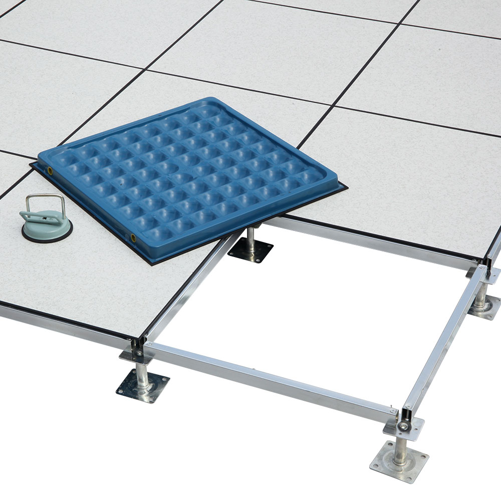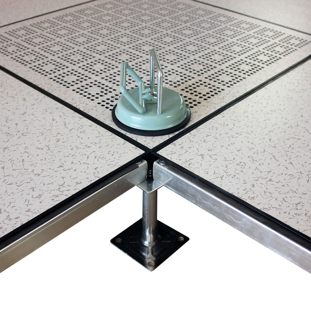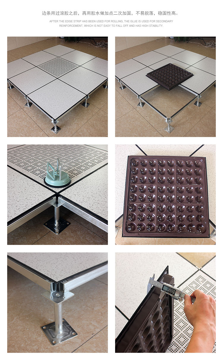 全鋼防靜電地板為全鋼組件,分有邊、無邊、微邊(三種邊處理方式)。底面采用SPCC深沖冷軋板拉伸成型鋼板厚度(0.4~1.5mm),球窩狀結(jié)構(gòu),增加地板的機(jī)械荷載強(qiáng)度。面板采用硬質(zhì)SPCC鋼板(0.5~2.0mm),上下經(jīng)過點(diǎn)焊焊接成型,切邊沖孔后,經(jīng)防銹處理,環(huán)氧樹脂粉末靜電噴涂后,中間填充發(fā)泡水泥(可以根據(jù)客戶需求發(fā)泡不同重量),再經(jīng)過日曬養(yǎng)護(hù)后形成穩(wěn)定的承載結(jié)構(gòu)。地板上表層粘貼防火板(HPL)/復(fù)合PVC/ 通體PVC/陶瓷地磚等不同材質(zhì)的裝飾表層,達(dá)到產(chǎn)品花色的多樣性、可以根據(jù)客戶需求個(gè)性化定制產(chǎn)品。搭配聯(lián)網(wǎng)支架、支架、螺釘組裝后,定位聯(lián)接更加準(zhǔn)確、精度可靠。